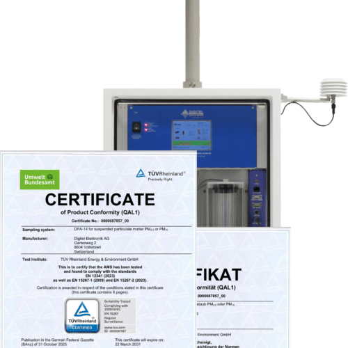 Digitel DPA-14 LVS achieved EN12341:2023 certification confirmed by TÜV and UBA (German Enviroment Agency).
